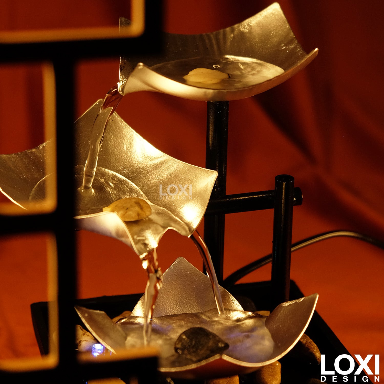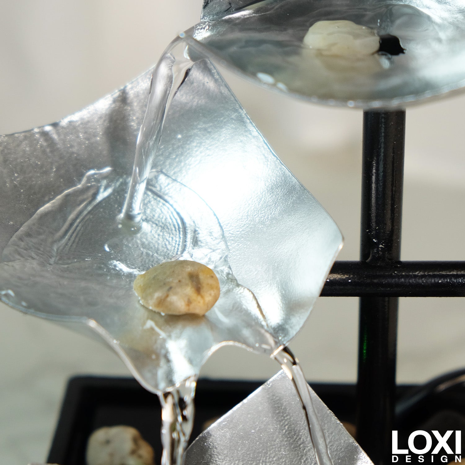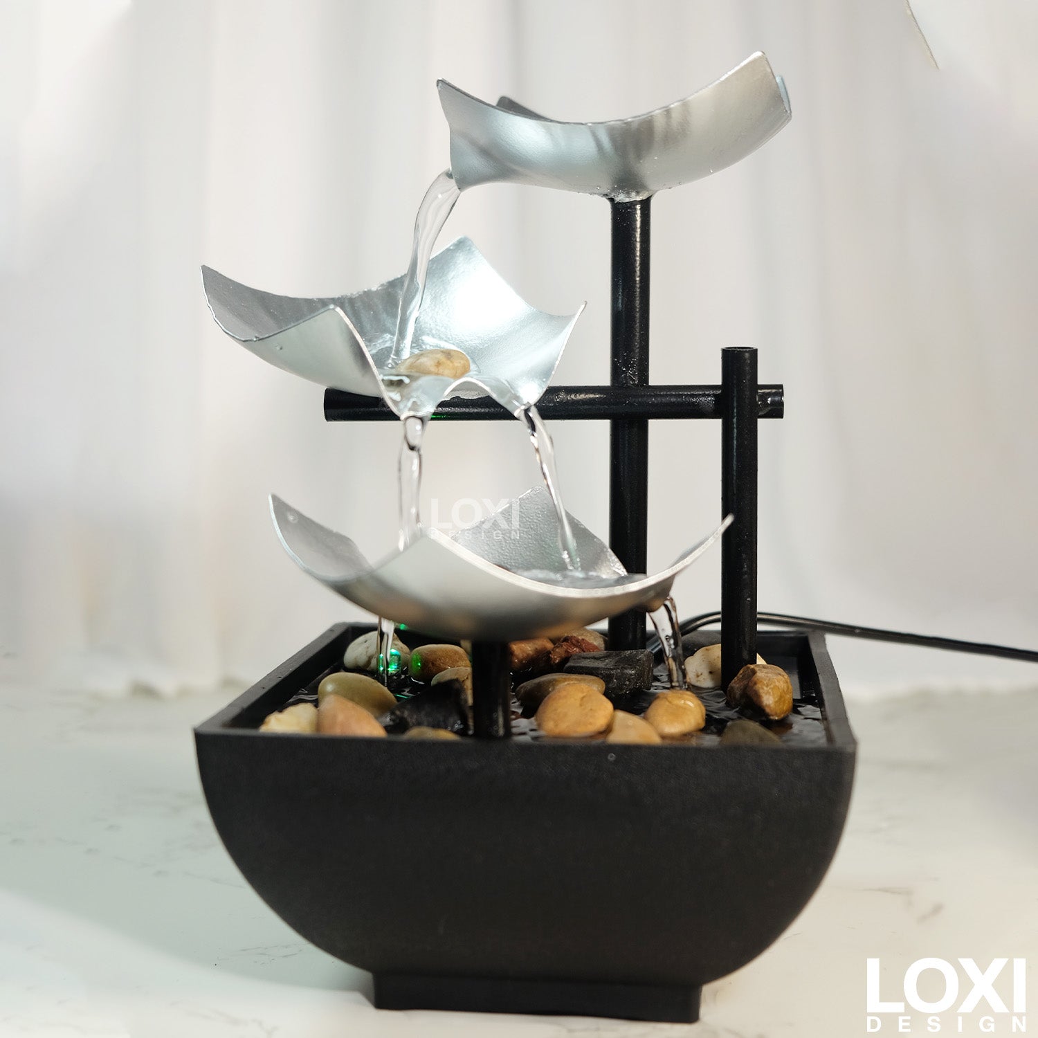 Therapeutic to enjoy watching & hearing the water elegantly flow through the silver tiers down to the pebble stone beneath.